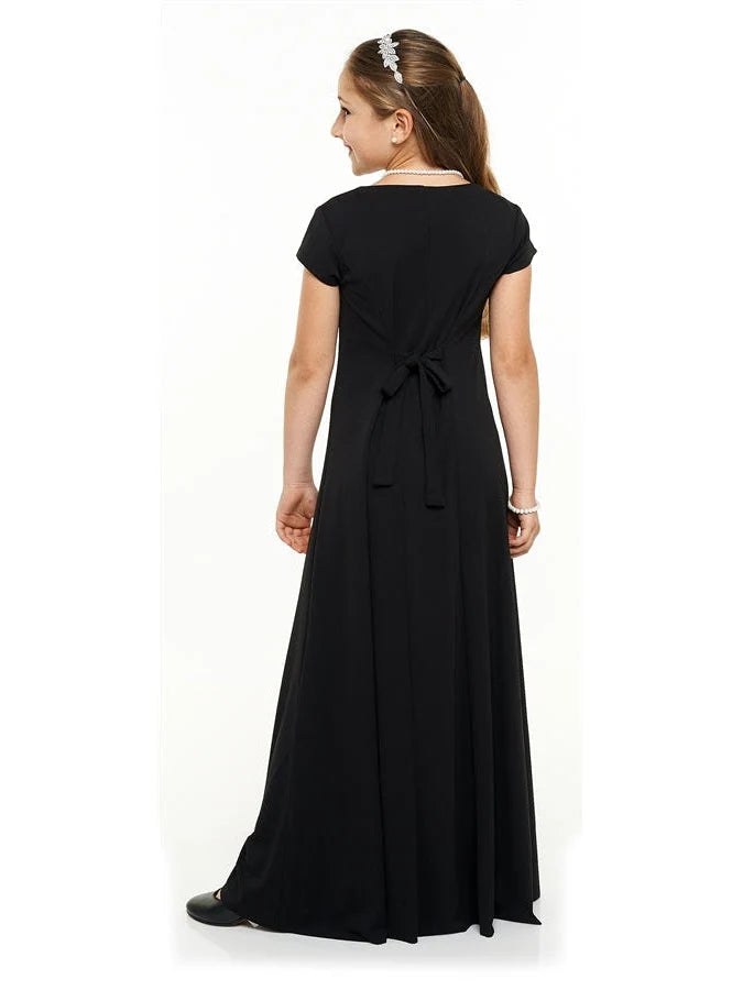 Save money with this quality, affordable youth size concert dress. Ideal for concert, orchestra, jazz, or choir programs. Scoop neck, cap sleeve, floor length gown with princess seams. Features back ties and no back zipper. Made in wrinkle resistant, easy care matte jersey stretch knit.. Call for quote on large school orders. Online group ordering available - contact us for details.