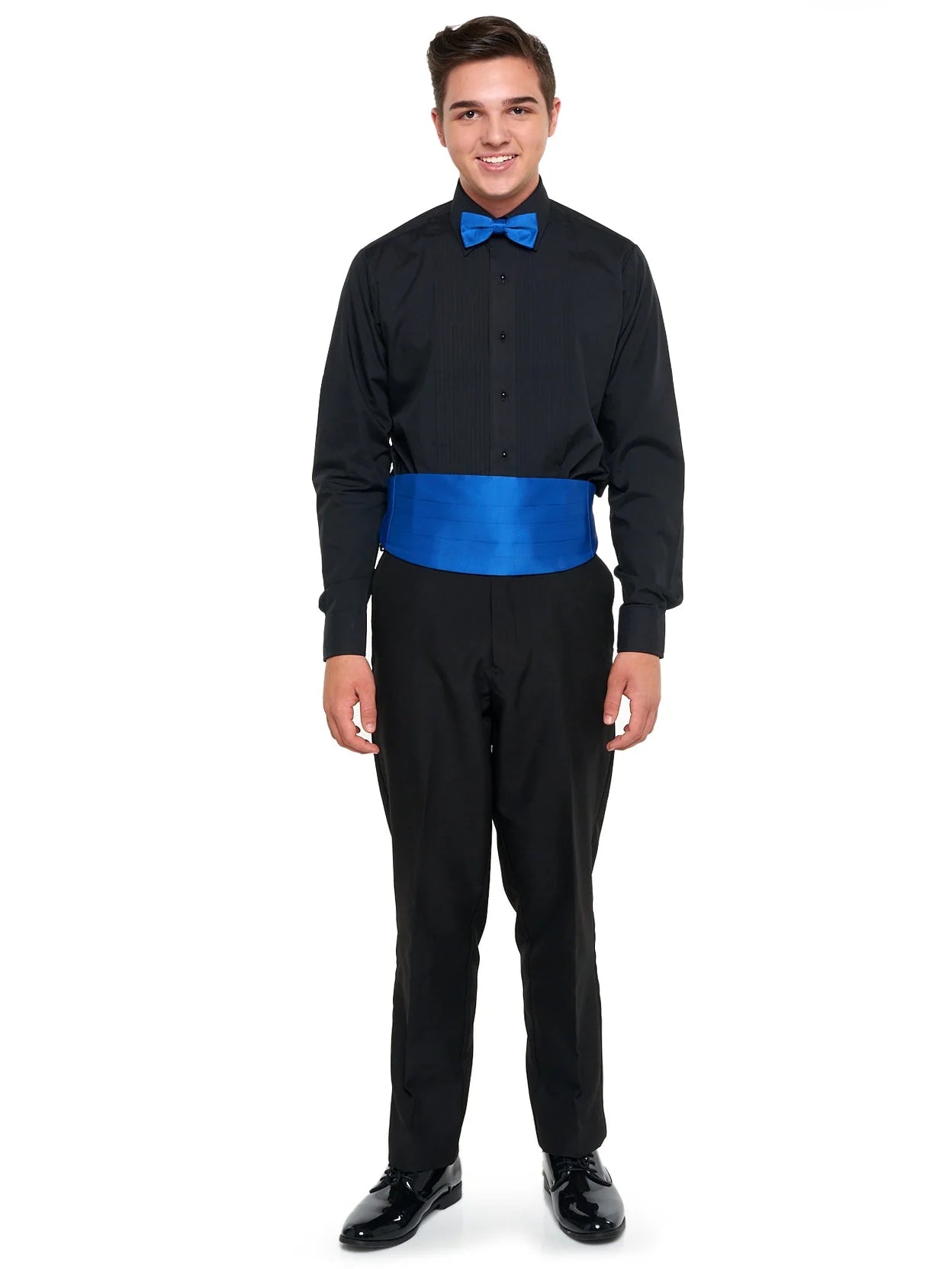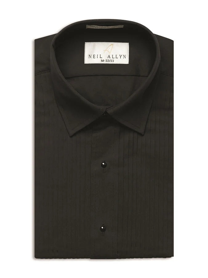 Black laydown collar, 1/4" pleated tuxedo shirt. Made in 65% poly / 35% cotton blend. Comes with black plastic studs.