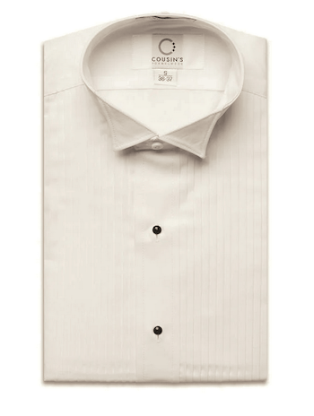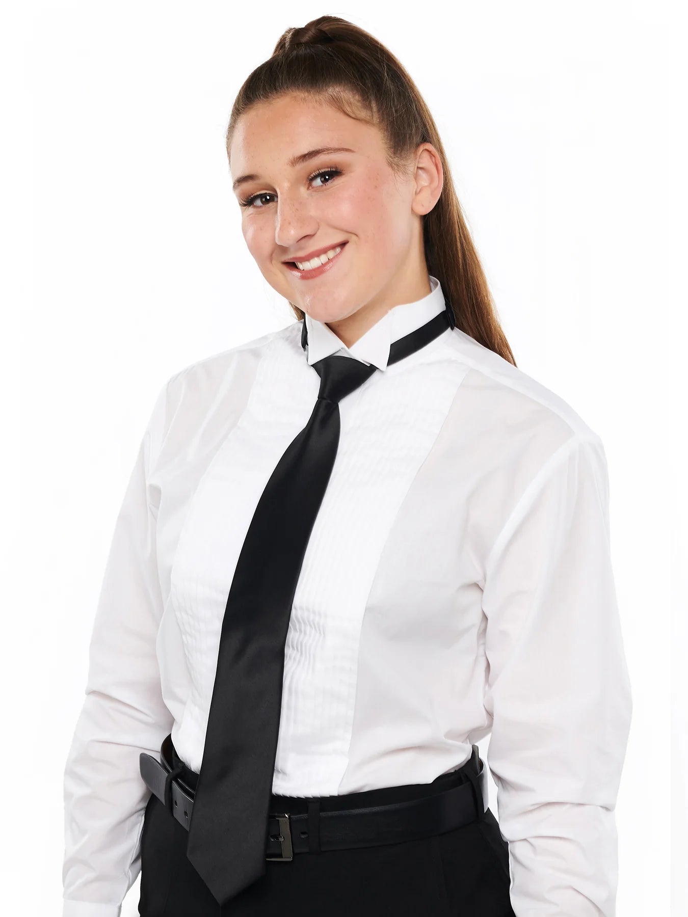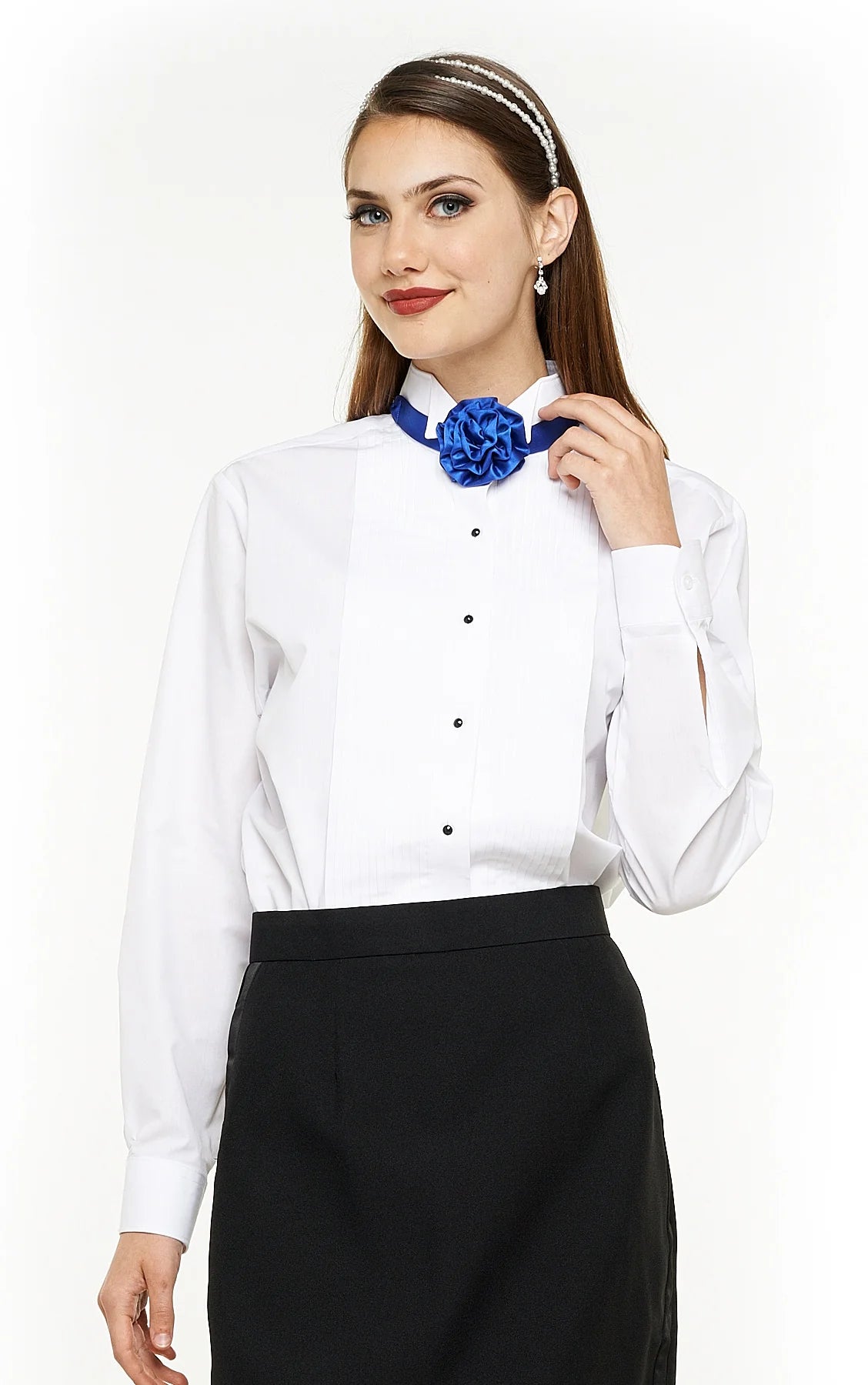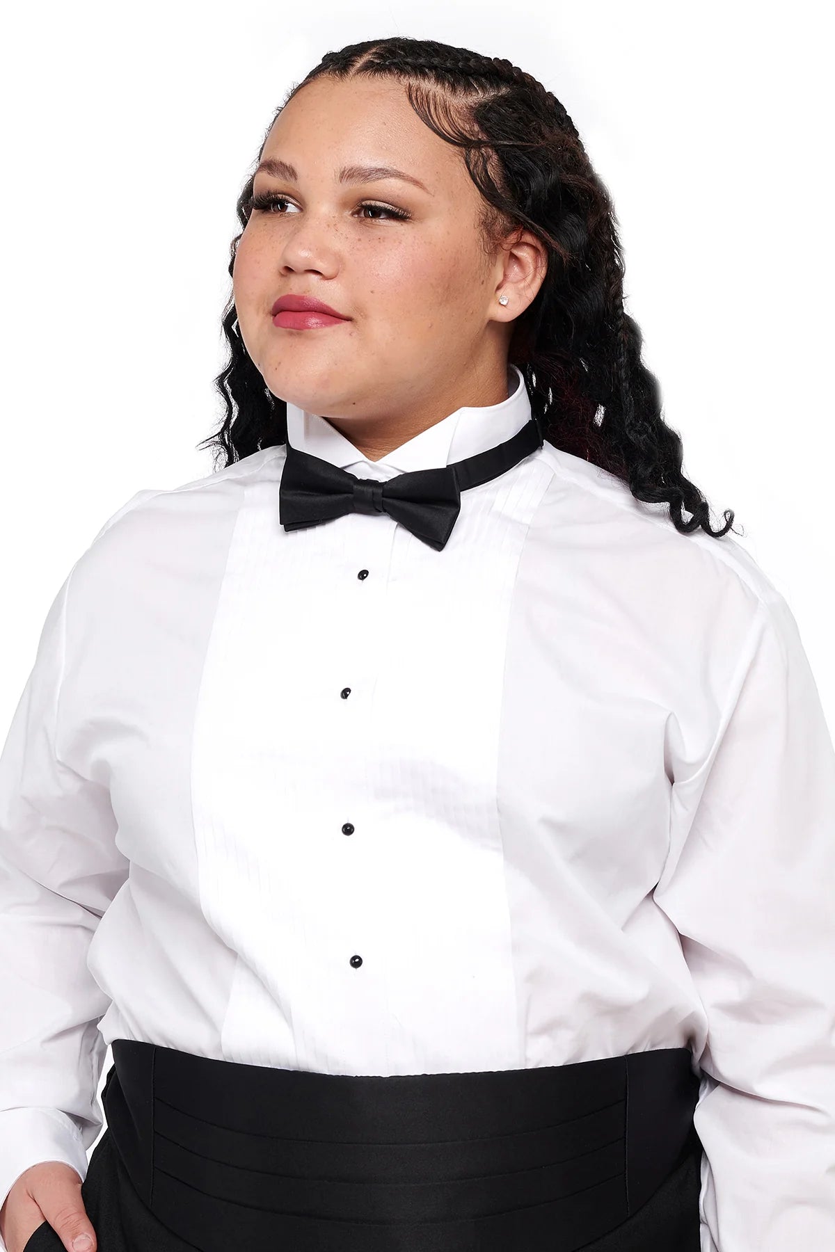 - Ladies fit white wing tip collar, 1/4" pleated tuxedo shirt.