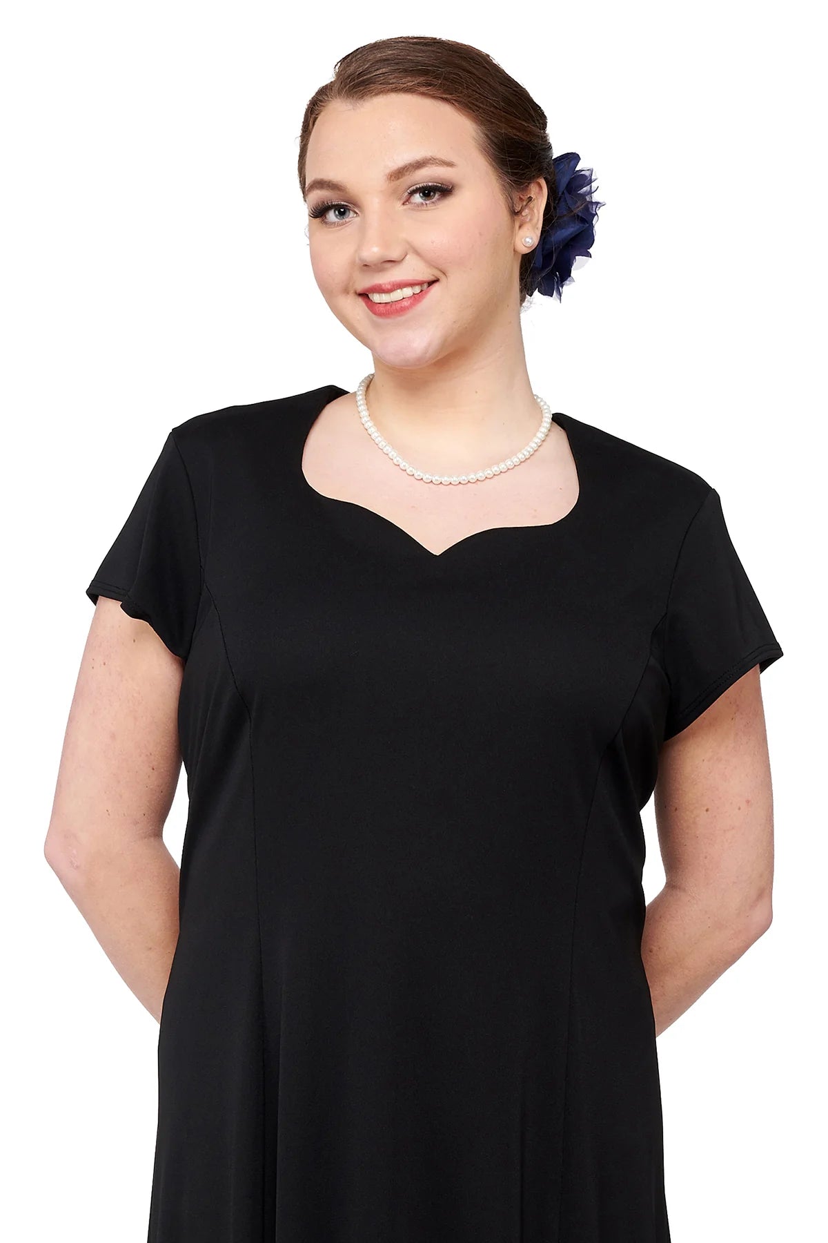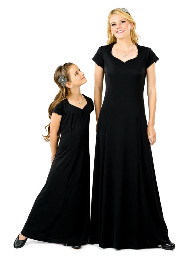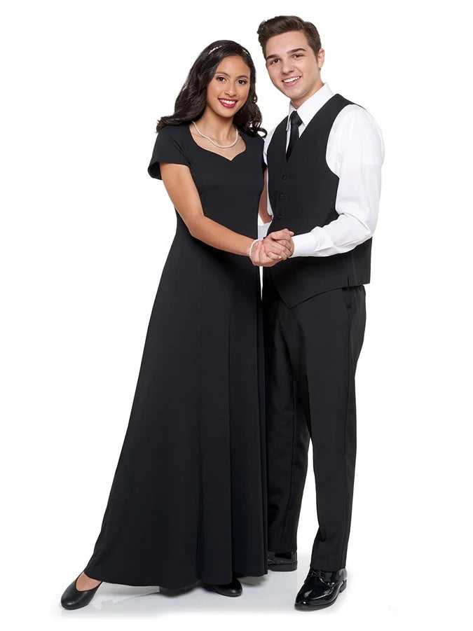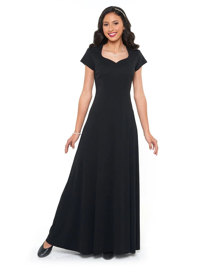 Save money with this quality, affordable concert dress. The Melissa Concert Dress is a heart shaped neck, cap sleeve, floor length gown with princess seams. Features back ties and no back zipper. Made in wrinkle resistant, easy care matte jersey stretch knit. Machine washable. Call for quote on large school orders.