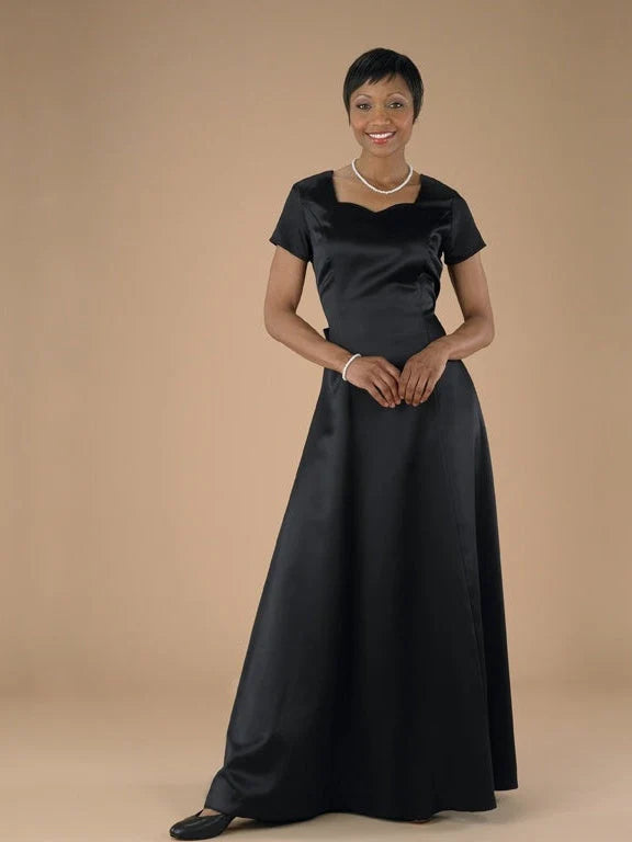 Shine on stage in this elegant floor length performance gown with princess seams, a sweetheart neckline, short sleeves, back ties... Read more