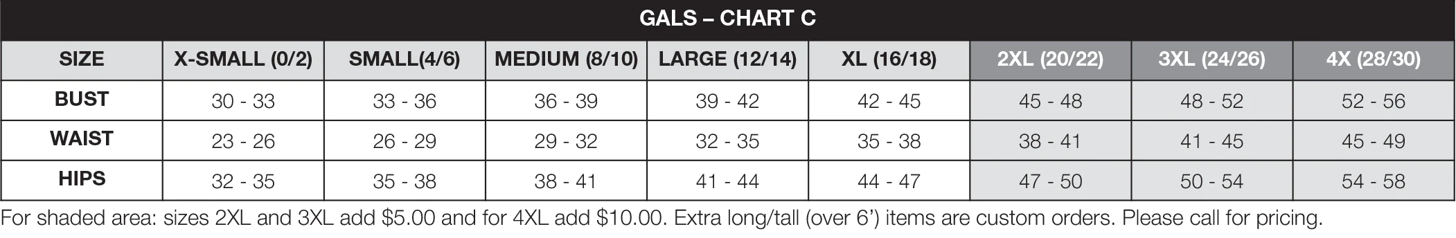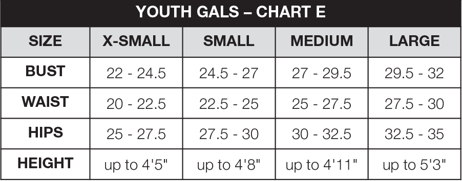 Adult sizes XS-5XL (size chart C) Youth S, M, L (size chart E)