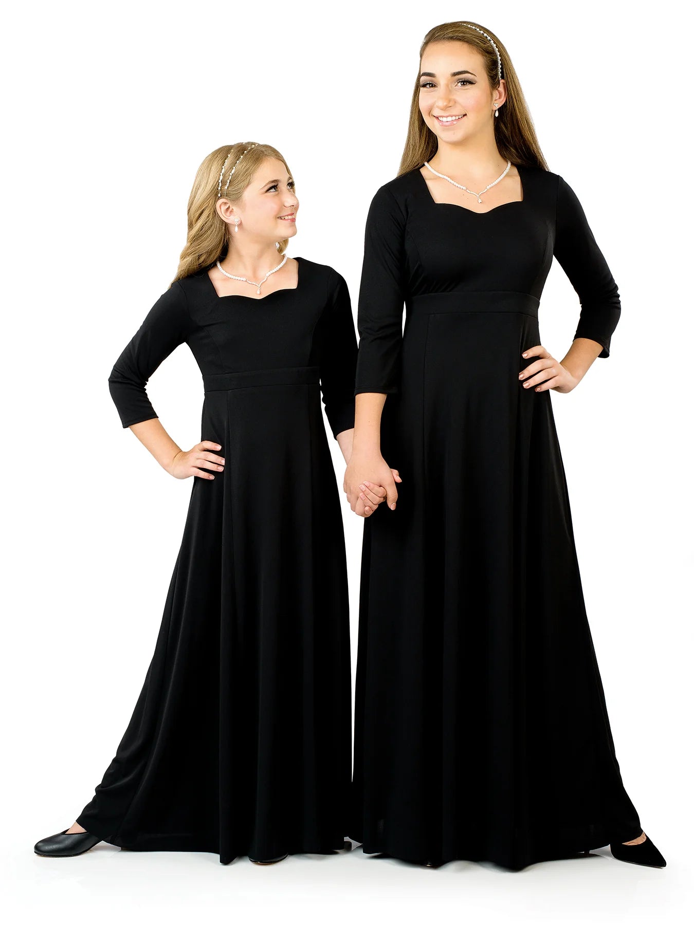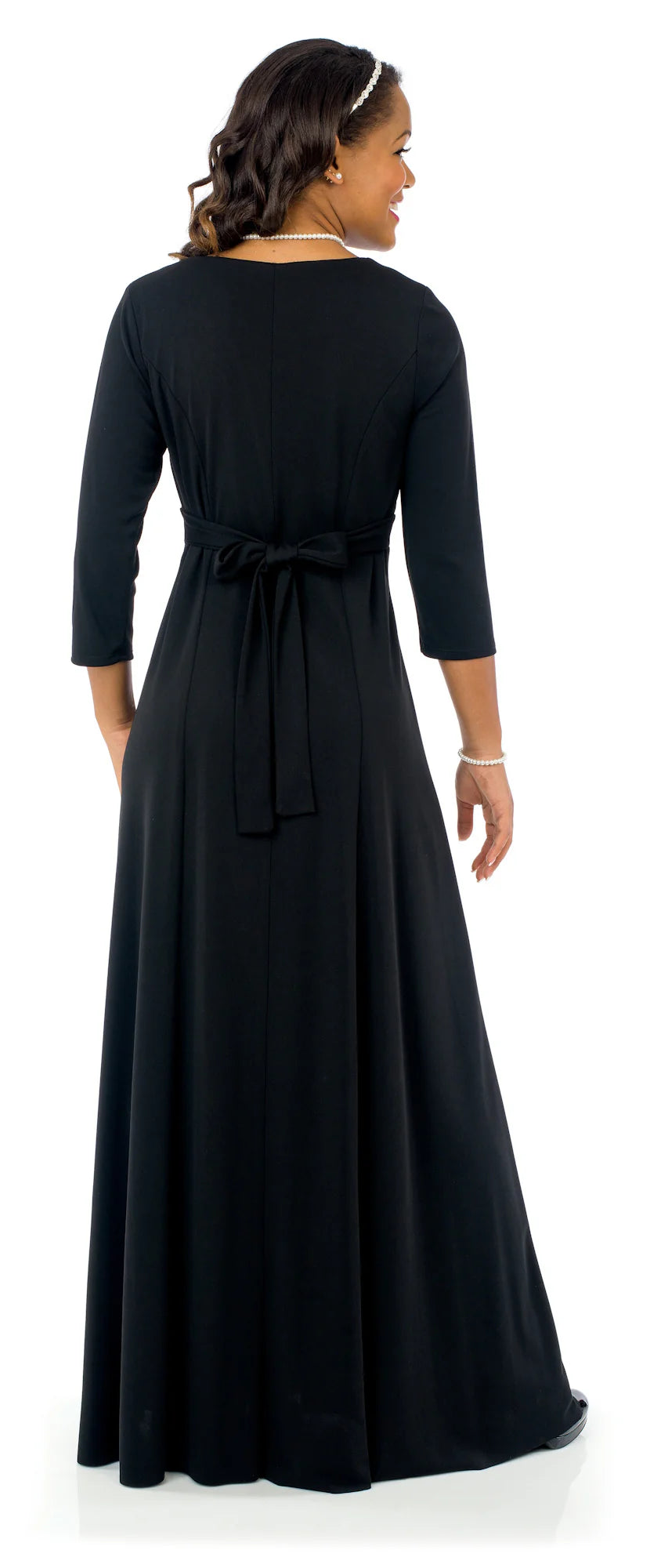 Save money with this quality, affordable concert dress. The Taylor Concert Dress is a sweetheart neck, 3/4 sleeve, floor length gown with set-in-front empire waistband. Features back ties and no back zipper. Made in wrinkle resistant, easy care matte jersey stretch knit. Machine washable. Call for quote on large school orders.